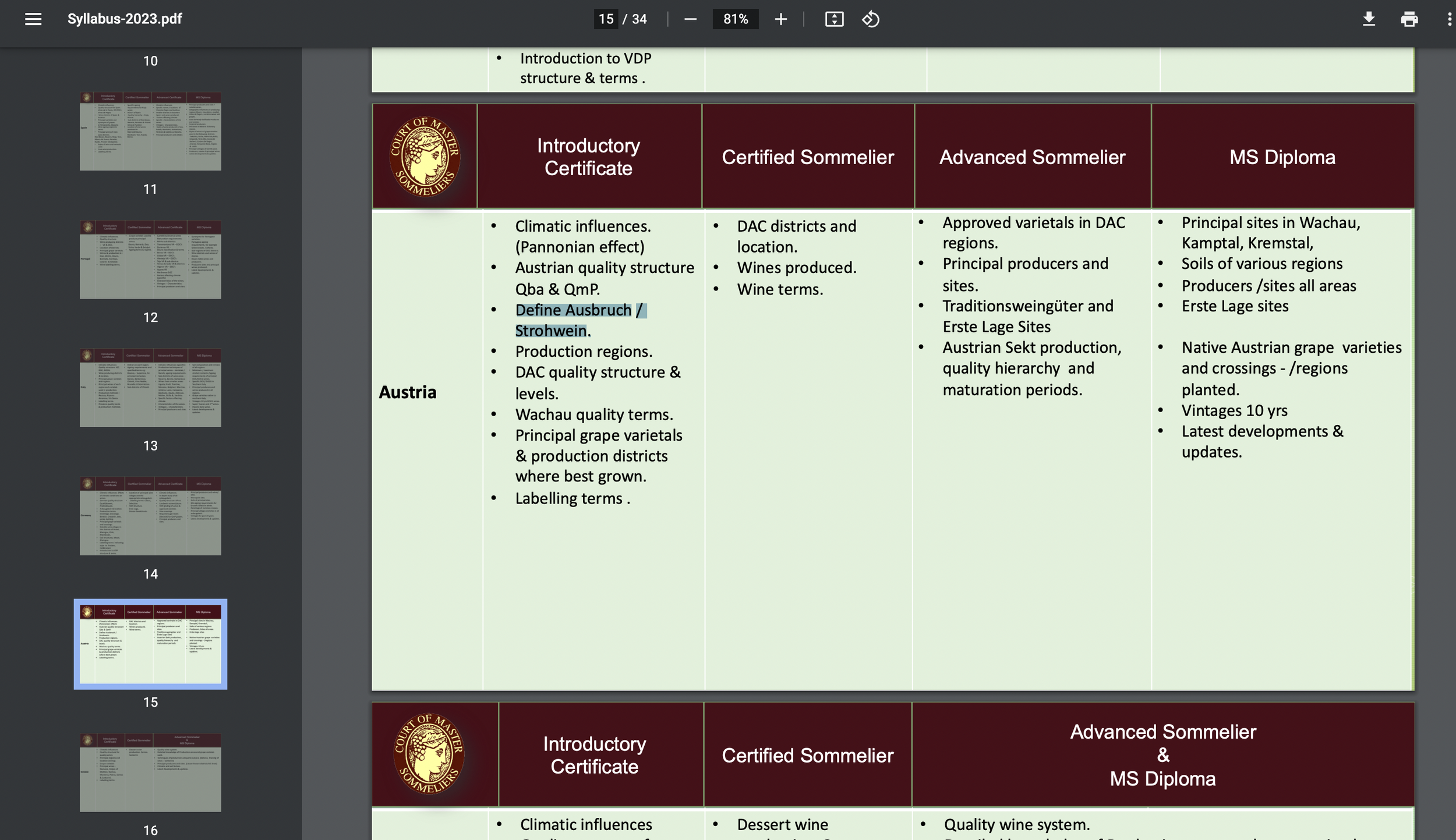 Choose Your Topic: Look at the syllabus's 'Introductory Certificate' column and pick a topic. Go with 'Define Ausbruch/Strohwein' under the Austria section.