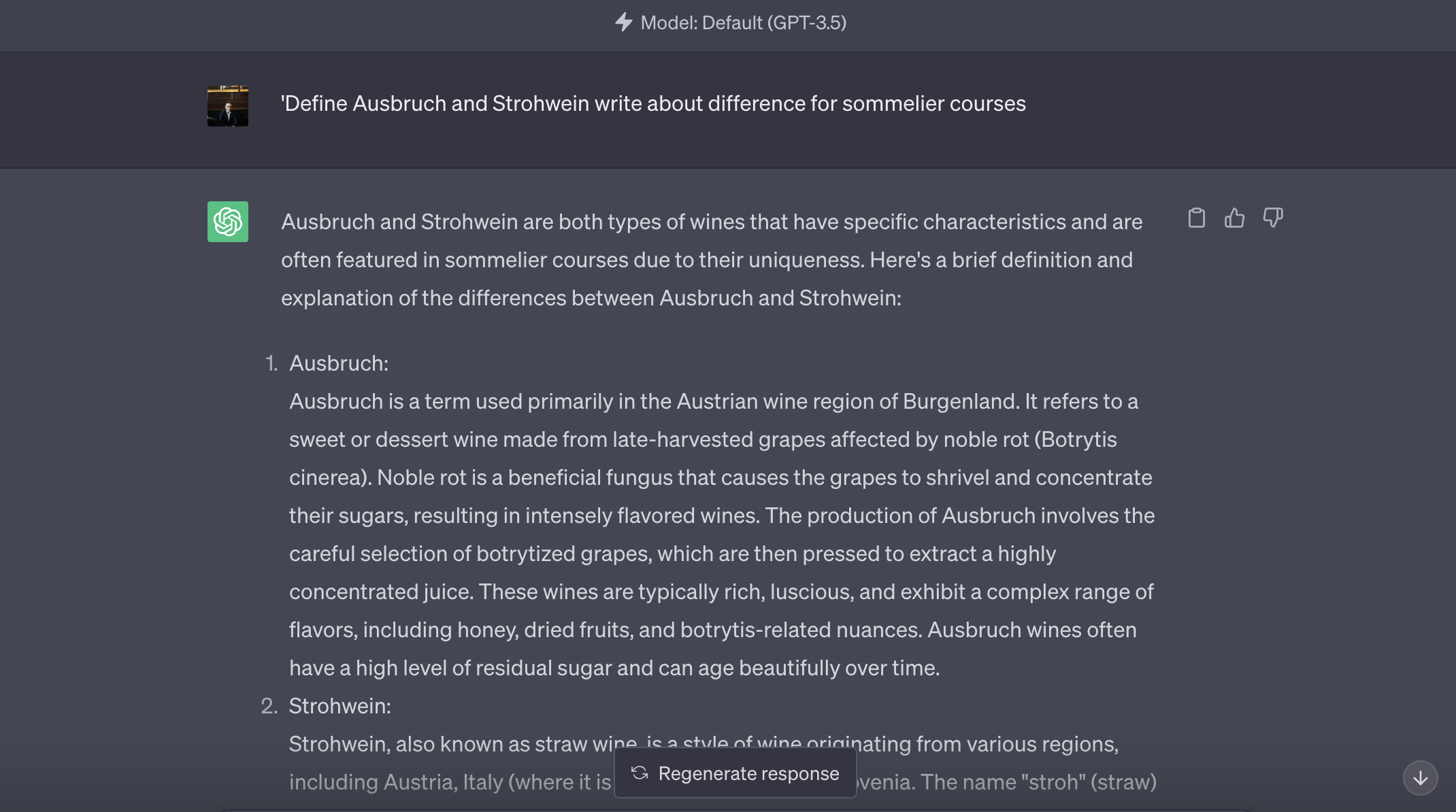 To understand how ChatGPT operates, let's revisit our earlier topic - 'Define Ausbruch and Strohwein'’ This time, we'll add a twist and ask ChatGPT for an explanation suitable for sommelier courses. Trust me, it's as simple as it sounds!